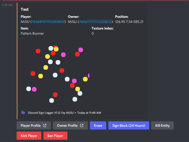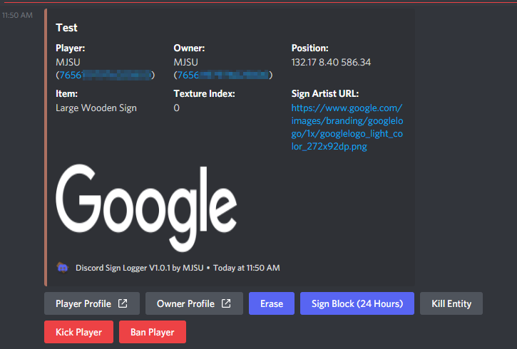 • Customizable Discord Buttons to take action against the entity / player that updated the sign
