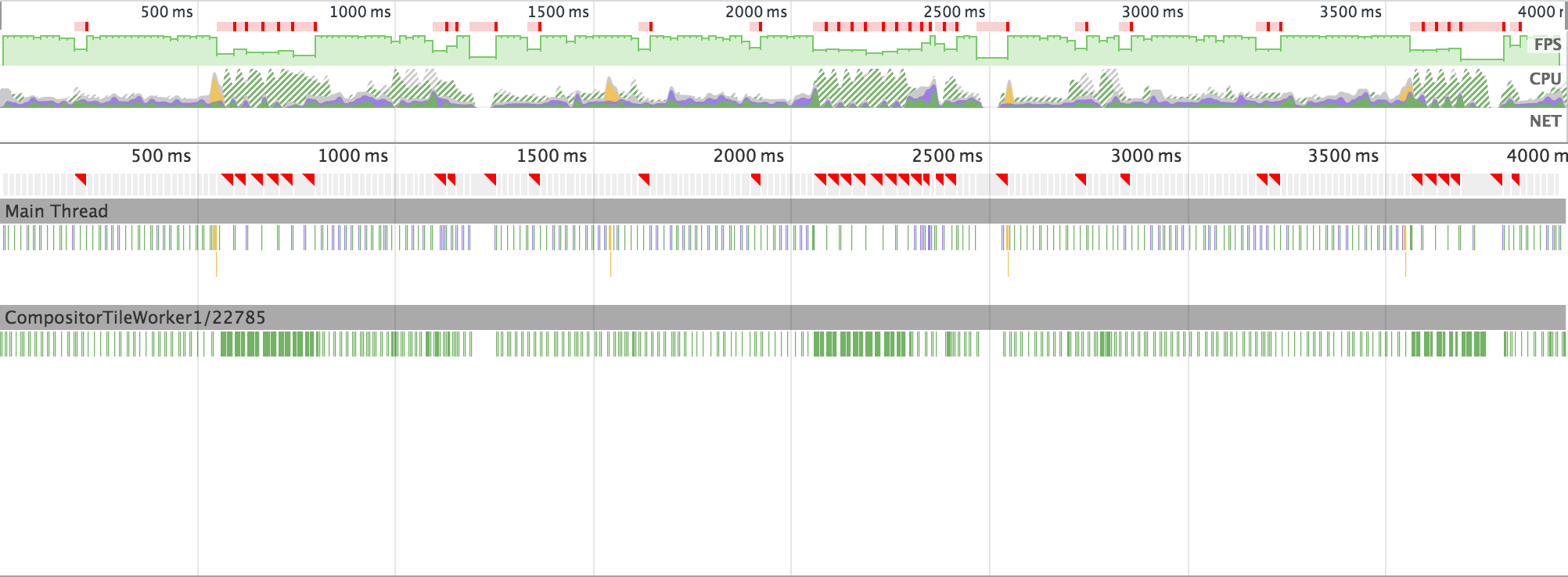 (For these unfamiliar with DevTools Timeline - red marks point out lost frames and the FPS graph should, ideally, be all green and flat.)