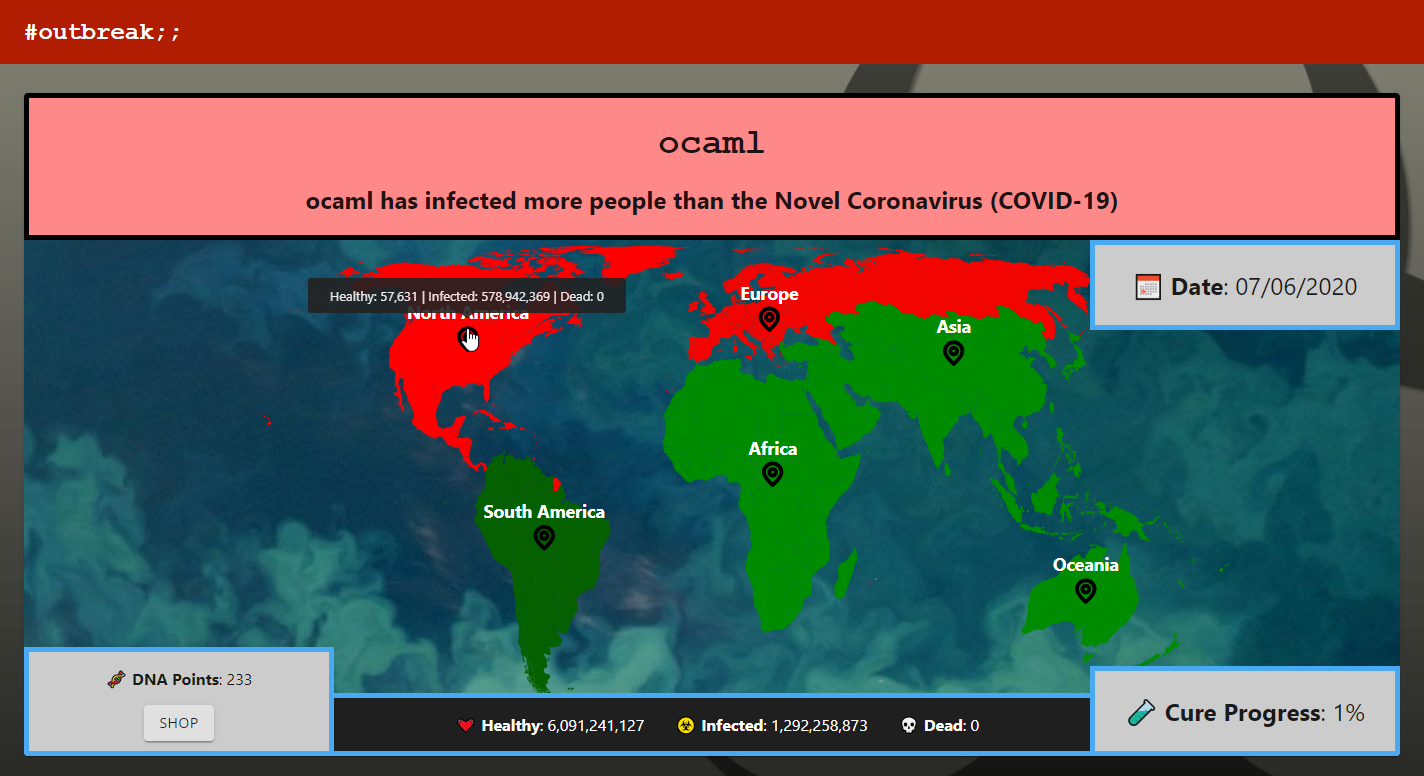 Inspired by the famed game Plague Inc., you start by choosing a disease to play and picking a country to start in. Depending on the attributes of your disease, it infects people in that country at a certain rate with certain symptoms. The simulation model will take into account the status of different countries (for example, the UK shutting down airports would make it less likely for your disease to enter) and determine how your disease spreads. Different “genes” which can improve infection rate, create fatal symptoms, or improve cure resistance can be bought as you infect people and earn “points”. As you progress and the disease and its symptoms become recognized across a sizable amount of people, borders shut down and the world starts to counter your disease with a cure. Your goal is to infect and kill the whole world before the cure is created and distributed.